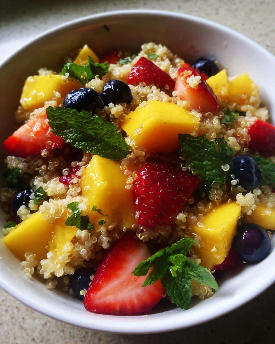 Amiga… olha essa combinação. A quinoa soltinha, os cubos suculentos de manga, morangos fresquinhos, mirtilos…